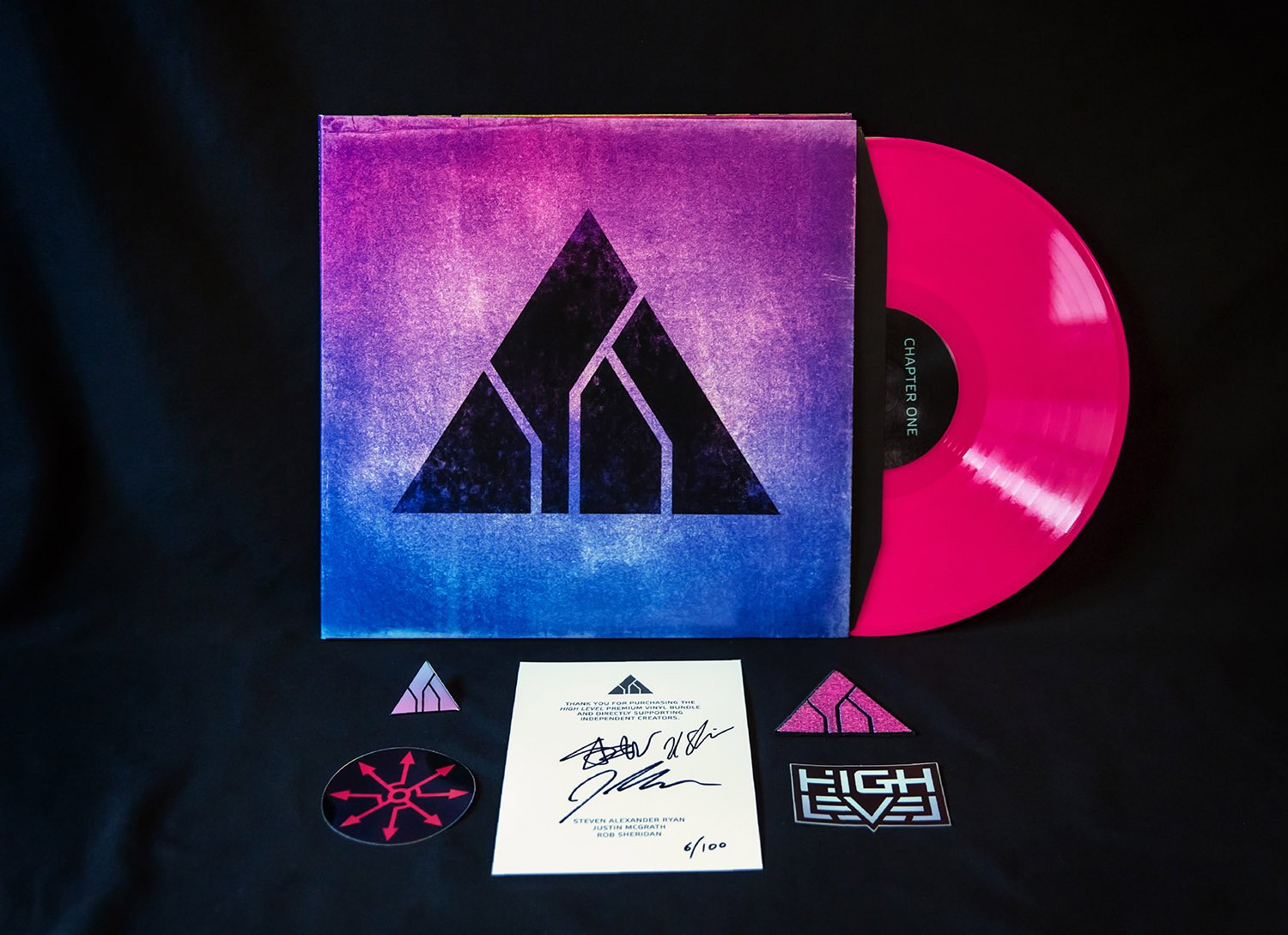 The long-awaited HIGH LEVEL original soundtrack by Steven Alexander Ryan and Justin McGrath in a limited edition triple colored vinyl package, signed by Rob Sheridan, Steven Alexander Ryan, and Justin McGrath!