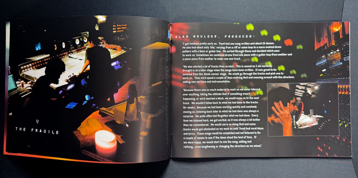 An original used 2000 NIN Fragility v2.0 tour program. This is a unique item from the 2000 Fragility tour that is very special to me, as it was the first book I designed and was filled with full color pages from my first year of photographing Nine Inch Nails. Much more than a simple tour program, this book was personally overseen by Trent Reznor and documents the recording of the album and the experience of the tour through the words of the people involved and rare photos never printed anywhere else. There aren't very many of these out there anymore, and I only have a few of my copies left. I hope someone enjoys this as much as I enjoyed making it! As this is original preowned memorabilia from my personal collection, the book has some light wear and scuffing on the front and back cover, but the interior pages are in excellent condition. See photos.