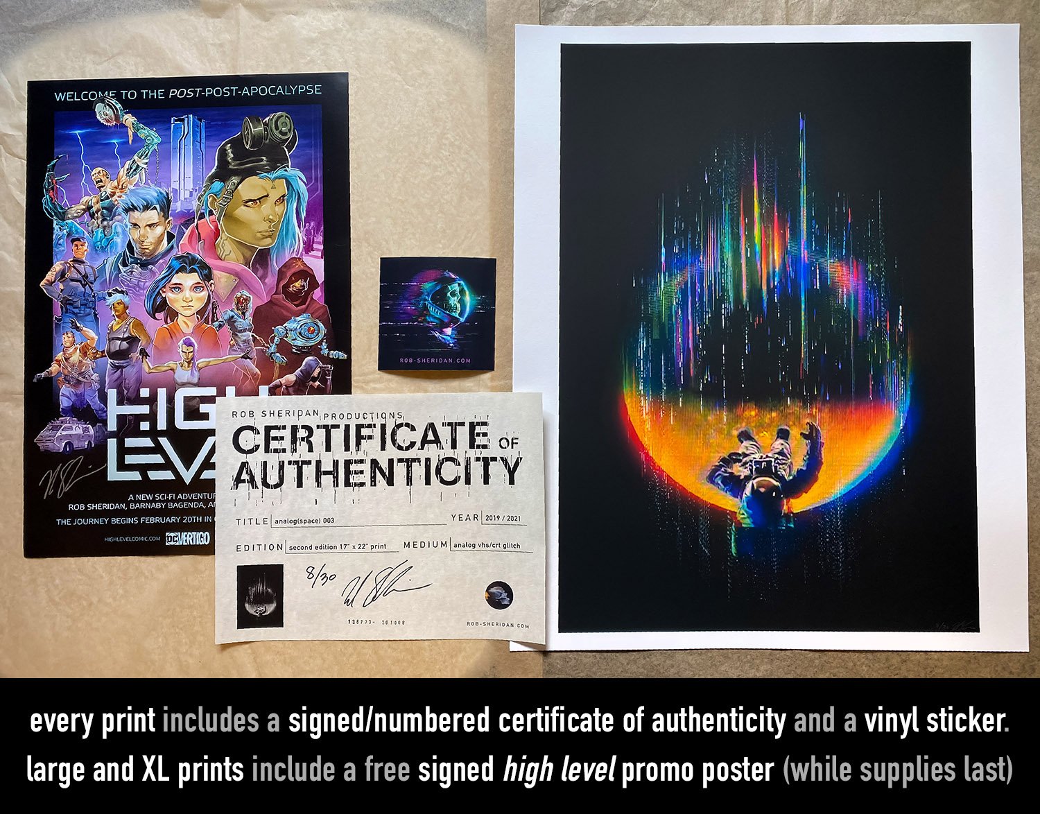 Analog glitch art inspired by my love of vintage space travel. Skull variant of analog(space) 002. Personally signed/numbered fine art print on museum quality Hahnemuhle archival matte paper, limited print edition of 30 pieces. Includes certificate of authenticity.