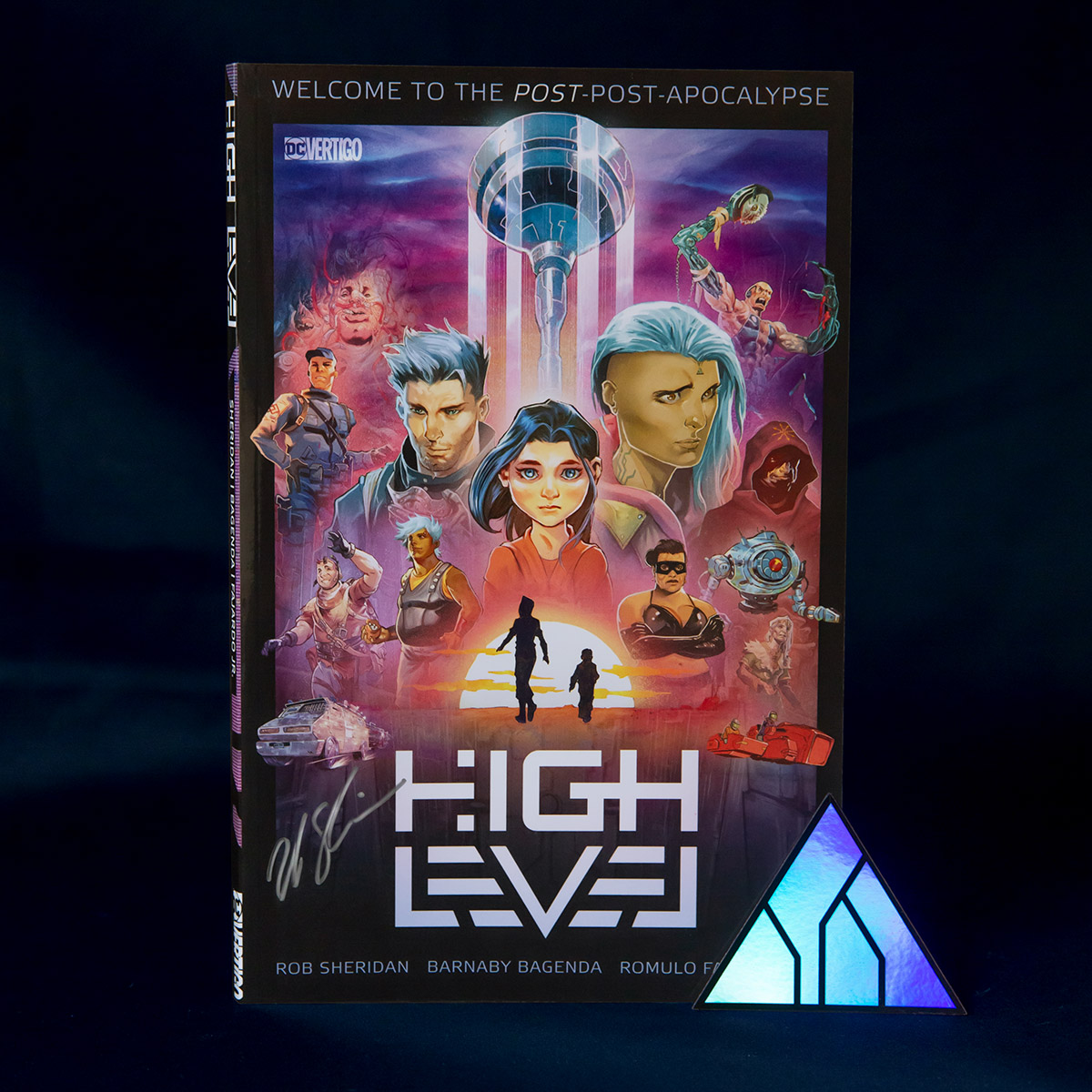 The collected edition graphic novel of "High Level" volume one, personally signed by author/creator Rob Sheridan. Includes a bonus holographic High Level sticker!