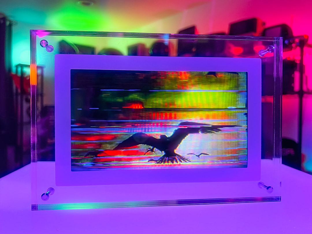 8.4" x 5.8" clear acrylic enclosure with a floating 7" vibrant HD screen (The number 1/10 XL is 11.4" x 7.5" with a 10" screen). The back side is personally signed/numbered by me directly on the acrylic. The ~10 minutes of video content will loop forever, a sleek always-on video art piece for your home or office. It is meant to sit on a desk or shelf, it does not include wall-mounting hardware. USB powered (includes cable and power brick) and also contains an internal battery that will allow it to play unplugged for approximately two hours. It does not play audio, as it is meant to be always on in your space. As it is a proper limited edition art piece, the video content is hard-wired into the piece, and cannot be changed. There is no SD card or ports of any kind (other than the power cable), there are no buttons on the piece at all. You cannot pause/rewind/etc, there are no controls for brightness or anything else. It is a self-contained piece of art. When you take it out of its custom box, it will begin playing. When you put it back in the box, it will stop playing.