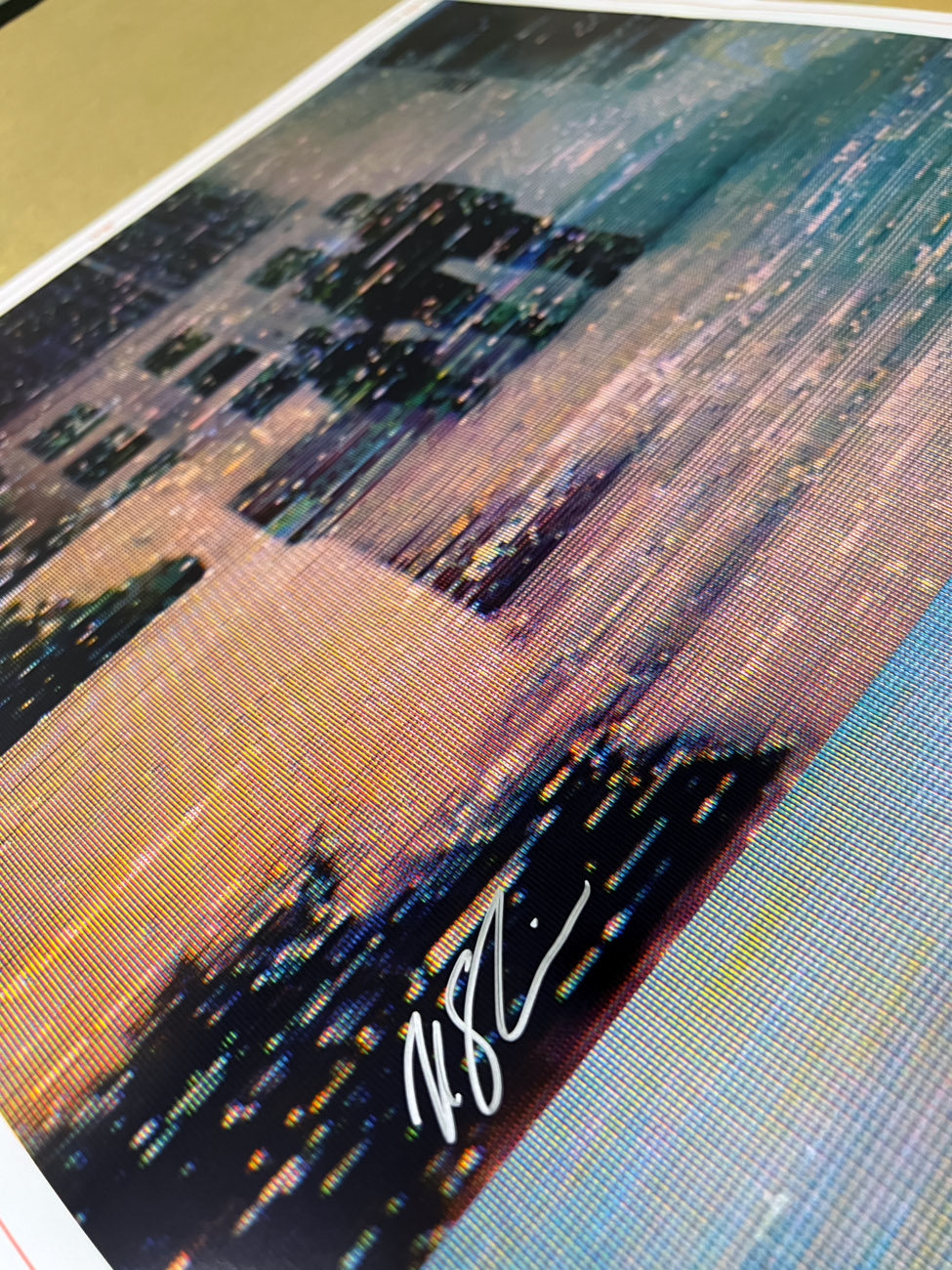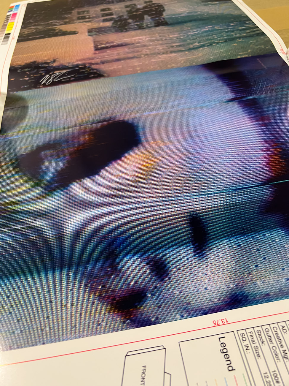 This is an original one-of-a-kind printer proof used in the production of the 2012 Welcome Oblivion vinyl package, featuring two full vinyl-sized panels of analog glitch art from the interior package, connected in a unique way due to the uncut/unfolded layout of the proof.