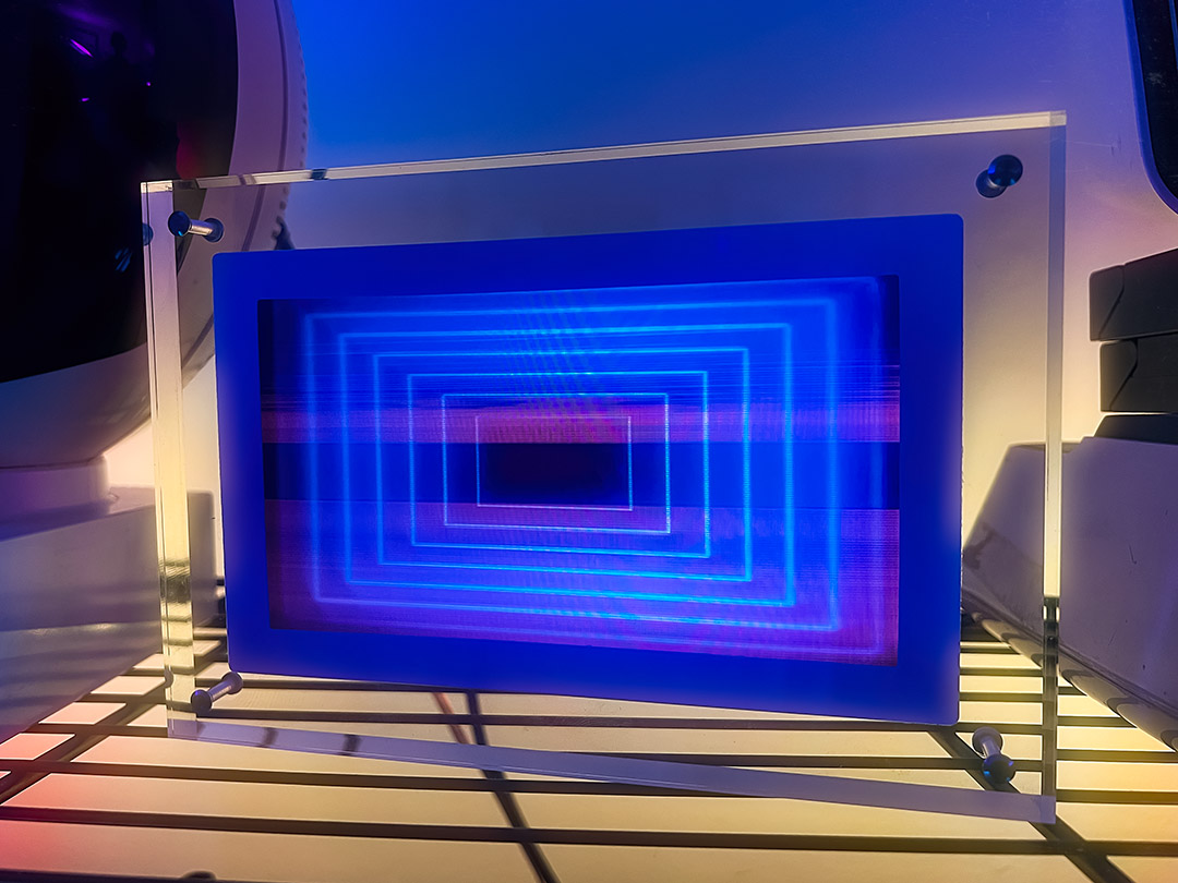 Channel Two: The Tunnel is a hypnotic window of purely abstract imagery: Neon geometry, glitchy patterns, and flickering TV scan lines, created 100% with old video hardware. My first video prints commemorate the ten year anniversary of my analog glitch work. They play an endless loop of video art culled from my 2012-2013 VHS/CRT glitch art. Much of the work in Channel Two was used in the How To Destroy Angels 2013 tour.